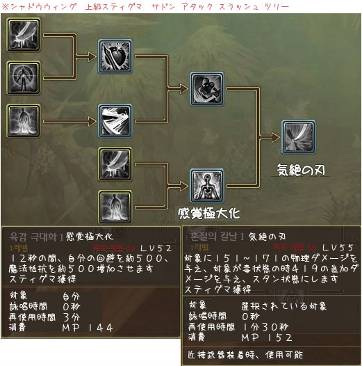 2010.09.19 Sun 11:05:04 [AION] 2.0シャドウのスティグマについて妄想してみた毒スタンルートのシャドウの動画が馬酔木さんの所で紹介されちょりました。 毒スタンルートのシャドウPK動画⇒http://channel.pandora.tv/channel/video.ptv?ref=em_nom&ch_userid=ikul00&prgid=39172431 馬酔木さんのぶろぐ⇒http://raveasibixi.blog38.fc2.com/ 動画重すぎだろjk・・・止まりまくるぞコンチクショウ! 解除不可毒のスティグマは入れてないようですね、ドラス使わないでポイズン使って毒になったら使うって感じでこの動画の方は使ってるようです ぶっちゃけ55上級スティグマ枠はイズ魔じゃ開放出来ないだろうと思ってましたw 前の仕様のままだったら無理だろうと諦めてましたがこないだ(む)ぶろぐさんのほうで記事がありましたが最後の枠の難易度がだいぶ緩和されたみたいですね、しかもソロで出来るとか! (む)ぶろぐさんの記事⇒http://aion.mutukina.net/archives/2010/09/15191058.html#more これは嬉しい修正ですね、これでスティグマは色々考えられそうです(´ω`) しろくまさんから画像をお借りしました。 一番バランスがいいのはサドスラルート+感覚極大化、アンプ、イヴェ、クイック、ウォークなんじゃないかなと思ってます、僕は多分この構成で行くと思う ウォーク抜いて毒スタンでもいいんだけどやっぱりウォークの便利さははずせないなぁ・・・自分のタイミングで襲えるしハイド2種あるとやっぱり逃げるときも便利だし、ウォークでストーキングする時のドキドキ感はやっぱり捨てられないよね(/ω\) アサシネーションが2.0で強化されたので毒系もありと言えばありだと思うんですが見た感じ動きながら撃てないっぽいのがダメなんじゃないかなと思ってます まぁー使ってみないとわかりませんけどね! ハイドで近づいて刻印3段階入れてアンプかなんかで一回スタンさせてリムーブ使わせる⇒感覚極大化と回避スキルで7秒間気合で耐える⇒サドスラ、エアリアルで打ち上げって一気に落とすってやれば結構いけるんじゃね!?ww エアリアルはやく10mに修正してくれ・・・Orz