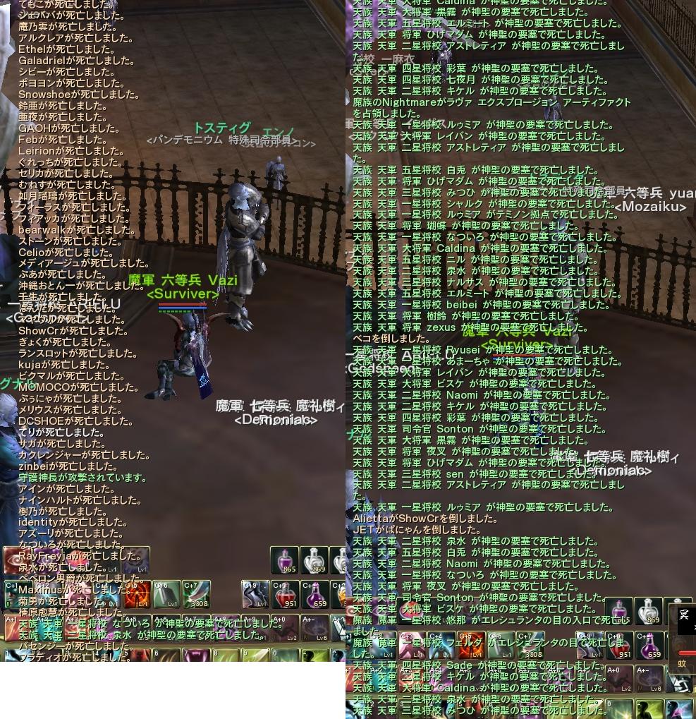 何か適当な日記ヽ(´ω`)ノなんかオタクっぽい日記。PAGE | 21 22 23 24 25 26 27 28 29 30 31 | ADMIN | WRITE 2010.06.27 Sun 02:56:24 [AION] 深層が緑にっ!!!!深層って落ちるもんなんだなぁ・・・・( ´ー`) まぁー今落とすメリットとかなさそうですけどね、2.0で深層ID来るみたいですし予行演習的な感じだったんですかね イズ鯖の天族は半年ぐらい内周ずっと守ってきましたし装備も整ってるだろうし、魔族と比べて2-3倍は人数もいますからやろうと思えばいつでも出来たのかもしれませんがやっぱり深層落とすとかすごいですなぁー 魔族なんかレジェ龍4匹投下されただけでヒイヒイいってるというのに・・・www 死亡ログのほんの一部です、こんなログがこれの5枚分ぐらいで埋まってました 神長の近くにはランカースキルもった変身した人じゃないと即死するレベルの攻撃がくると聞いているので将校とかのログがすごいですなー イズ魔族はなんだろう・・・PK相手には不足しないとは思います、何処いっても天、天、天ですからっ! 面白い鯖といえば面白い鯖です(´ω`) おまけ HAHAHA TUEEEEEE!!!!!! 30アビス弓と合成してみました、強いですね、17万ちょっとのAPで8%の対人補正ですか・・・ 僕は6%のために62万もAP貯めたんですけどね・・・二刀流ってなんなんだろうね。 両手武器合成はゆとりです。