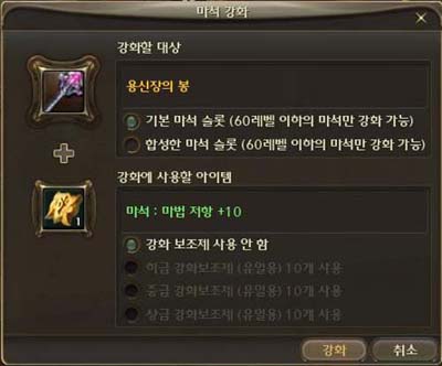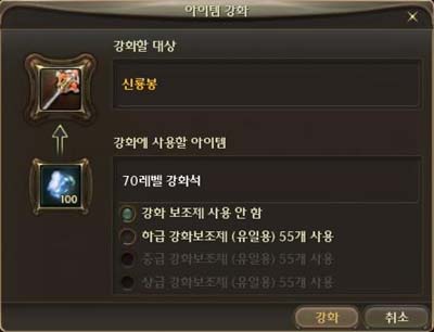 - グレートソード,ハルバード,ワンド,マジックブック,オーブ,弓の様な両手武器を合成する事が出来ます。 ●合成された魔石スロットは別に仕分けされて、それぞれ強化を進行する事が出来ます。 例えば、主体両手武器の磨石強化に失敗すれば、主体両手武器の磨石だけ消えて、補助両手武器の魔石はそのまま維持されます。 - 合成された両手武器に魔石強化をする場合、強化をするスロットを選択する事が出来る 強化ウインドウが出力されて、基本魔石スロット / 合成した魔石スロットを選択して魔石強化を進行する事が出来ます。 ●強化石 / 磨石強化確率を小幅上昇させてくれる強化補助石を追加しました。 - 強化補助石は下級 / 中級 / 上級があり、高い等級であればある程、強化確率が高くなります。 ●ユニーク等級以上アイテムの最大強化数値を +10 から +15 に変更しました。 - +1 ~ +10 強化は既存と等しい方式で強化成功 / 失敗が適用されます。